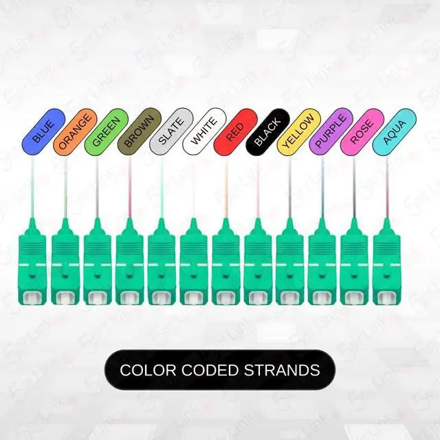 Low Insertion and Back Reflection Loss ^^ Ideal for use in Telecommunication Networks, LAN, WAN and Data Processing Networks ^^ Includes 12 Fusion Splice Protective Shrink Sleeves 2.5 - 60mm long ^^ Fiber optic strands are Individually color coded ^^ Available in Single-mode and Multi-mode (LC, SC, ST and FC Connectors)