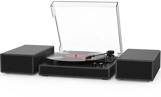 Comes with a 45 RPM adapter. The auto-stop function setting stops the record automatically when it reaches the end of the record, better protecting your records. The reinforced turntable effectively prevents vibration caused by playback, restoring the most authentic music for you. ^^ [Enhance Your Home Aesthetics] With its elegant natural wood design, this vinyl record player set seamlessly complements your existing bookshelf or furniture. The included 2 bookshelf speakers serve as both functional audio components and stylish decor, ensuring they blend harmoniously with your room's existing decor without occupying excessive space.