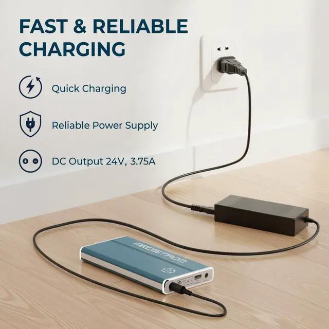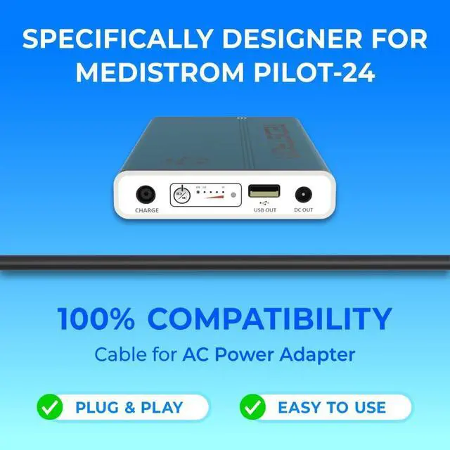 Seamless Compatibility for Pilot 24 Lite Charge your Medistrom Pilot 24 Lite CPAP backup battery with this AC power adapter. Designed with 2-pin Type A prongs for use in Canada, USA, Mexico, and Japan, ensuring reliable charging everywhere you go. ^^ Fast & Efficient Charging The adapter has an output 90W for quick charging of the Pilot-24 Lite. Do not use with other batteries. Only compatible with Medistrom Pilot 24 Lite. AC Input Voltage from 100-240V 50/60Hz 2.5A. DC Output 24V 3.75A ^^ Ideal Upgrade for CPAP Users If youre currently using a Medistrom Pilot-24 Lite with an AC adapter rated below 90W, this 90W adapter is a recommended upgrade.