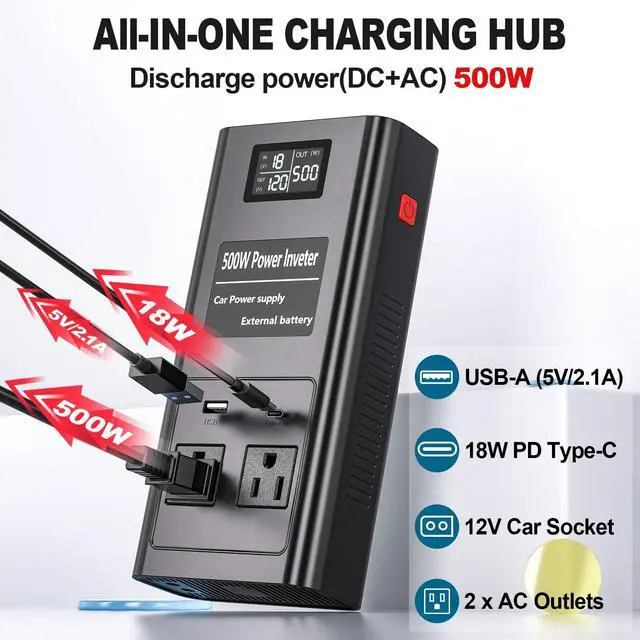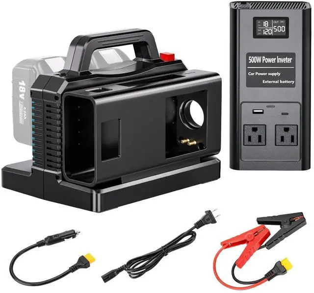 BATTERIES: Battery Power Adapter Doubles your runtime! simultaneously to extend operational runtime by up to 2X, for extended power. Generator Works seamlessly with just one battery too. Your reliable battery power station. (BATTERY NOT INCLUDED, POWER INVERTER ONLY) ^^ ALL-IN-ONE CHARGING HUB MEETS YOUR EXPECTATION: Simultaneously charge up to 4 devices! Features 2x 110V AC outlets (500W peak), USB ports (fast charging), and type-C ports. Perfect for phones, laptops, cameras, small appliances, and more during outdoor adventures or power outages. ^^