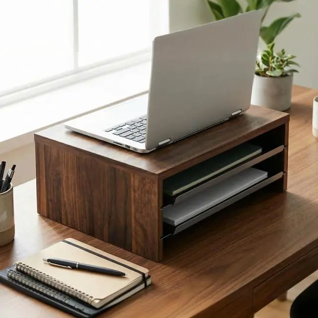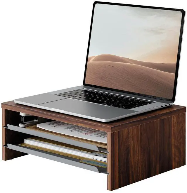 3 Tier Desk Stand Equipped with two sliding metal trays, Fenge monitor stand for desk allows instant access to USB drives, notebooks, and other small items. It helps free up to 30% of your desk space, transforming your workspace into a clean, minimalist zone in seconds. ^^ Ergonomic DesignRaises your screen by 5.3 inches, guiding your sight to a natural 15 downward tilt. This monitor riser promotes a proper 90 alignment between your neck and back, reducing slouching and neck strainideal for long hours of work or online classes.