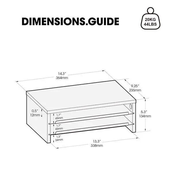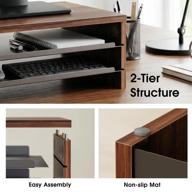 ^^ Sturdy & Slip-Resistant Crafted from premium MDF panels and rust-resistant metal shelves, this computer stand ensures stable typing without wobbling. Reinforced corners with silicone pads protect your desk from scratches. Tested to hold up to 44 lbs/20 kg, it remains durable and warp-resistant over time. ^^ Versatile Desk ShelfFeaturing 14.3 -inch wide, this desk riser functions as a laptop stand, printer stand, and desktop organizer. It adapts to various scenarios like office work and study, easily organizing your desktop devices. ^^ 3 Step Quick AssemblyWith pre-drilled holes, setup
