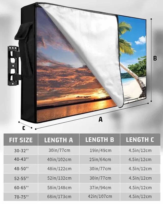 Outdoor TV Cover Size Chart30-32in /30x19x 4.5 in32 in smart tv40-43in /40x25x 4.5 in43 inch smart tv48-50in /48x30x 4.5 in50 inch tv52-55in /52x30x 4.5 in55 inch tv60-65in /58x37x 4.5 in65 inch tv70-75in /68x42x 4.5 in75 inch tvOutdoor TV Protector DesignFull coverage design avoids damage from the vivid elements, making your outside television always look like new. Warm TipsPlease measure the size of your TV accurately before purchasing a TV cover. Store the remote in the cover pocket. When youre ready to switch off and head indoors, always remember to place the remote inside its pocket on your outdoor TV cover.