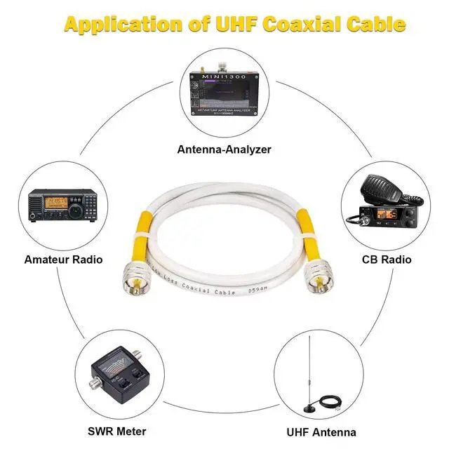 Applications -- This cb coax cable is widly used for vhf marine antenna, cb radio, ham radio, vhf radio, antenna analyzer, monitor, tuner, dummy load, SWR meter and ect. White marine coax cables are designed for use on boats and anytime a black colored cable isn't needed. ^^ Ultra Low Loss -- MOOKEERF rg8x coaxial cable(also called Mini-8) is a step up from standard RG58 coaxial cable. Its signal loss is much lower than rg58 cable. It could support better signal transfer with minimum signal loss over large distances and higher frequency use.