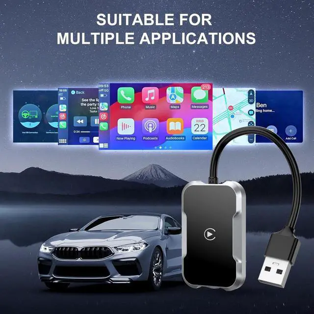 Wireless Convenience: Easily upgrade your wired CarPlay to wireless! Simply plug this adapter into your car's factory USB data port, pair your iPhone via Bluetooth and WiFi, and enjoy the freedom of wireless CarPlay without any complicated setup or extra apps. No more cables cluttering your cabin. ^^ Dual Connection & Full App Support: Utilizes stable WiFi and Bluetooth dual-connection transmission for low latency and a reliable link. Supports all your favorite CarPlay-supported apps, including native iPhone apps, third-party navigation, music streaming, and entertainment apps.