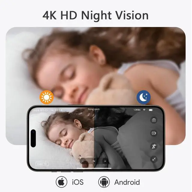 (not waterproof). ^^ FREE Cloud & 1-Min Quick Setup + Warranty SupportSupports cloud storage (FREE) and Micro SD card (not included) for worry-free loop recordingg without space worries. Easy 1-minute quick WiFi setup with video guided tutorials. Backed by warranty and professional after-sales service for a worry-free experience. New users can enjoy FREE Cloud accessno strings attached. (See user manual for activation) ^^ 4K HD Night Vision & Real-Time ViewingThis indoor camera features a 4K HD sensor for ultra-clear and vivid details day and night. Built-in infrared night vision captures crisp video in low light or at night.