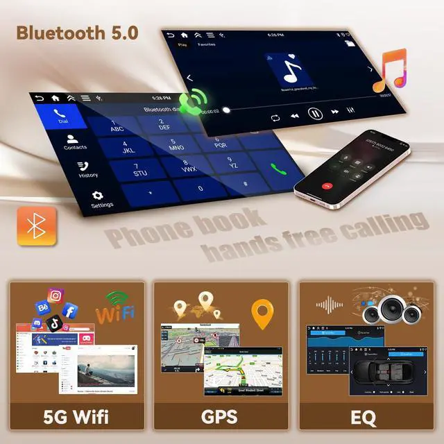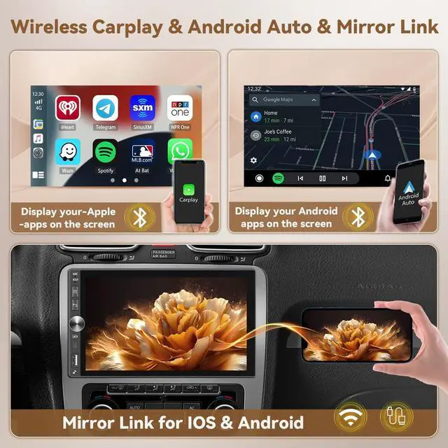Support Wireless&Wired Mirror Link with floating window mode for easy simultaneous navigation and vehicle settings (via WiFi or USB cable) /Split Screen/Multiple UI/AHD Backup Camera/Mic ^^ [Wireless Carplay, Android Auto & Voice Control] This double din carplay radio supports wireless CarPlay and Android Auto. Connect via Bluetooth for easy access to apps, email, contacts music, videos and more. Enjoy hands-free calling and voice control with 'Hey Siri' or 'OK Google' to help you stay focused on driving safely ^^ Bluetooth & Mirror LinkThis android double din GPS radio with built-in Bluetooth, support Handsfree Call, Phone book synchronization and Stream Music Play.