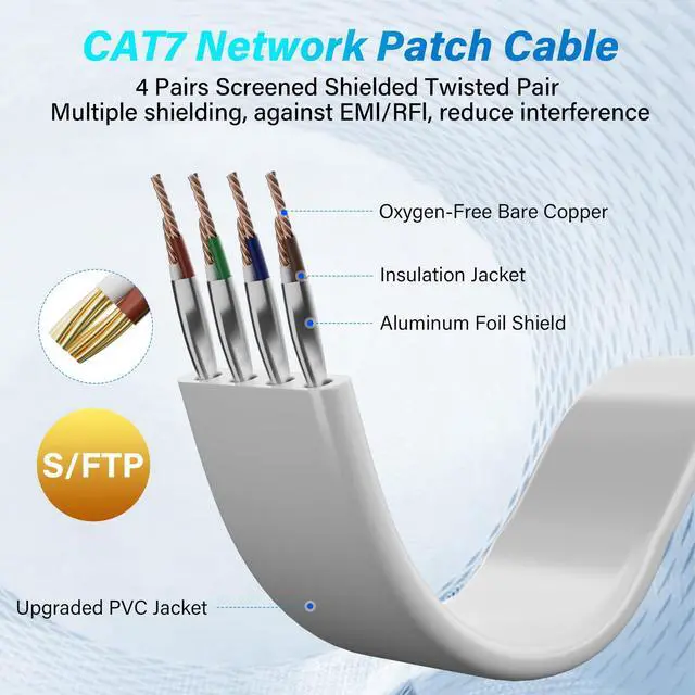 High Performance: 26AWG 100% pure copper conductors ensure durability and effective noise elimination, meeting RoHS standards----Gold-plated RJ45 connectors enhance shielding, resist oxidation and corrosion, and ensure stable transmission----Supports 600 MHz bandwidth and up to 10 Gbps speeds for gaming, 4K streaming, and large downloads with no lag----4-pair S/FTP shielding minimizes EMI/RFI interference, improving signal stability----Cat 7 cable meets ANSI/TIA/EIA 568-B standards, ensuring high-speed, reliable network performance ^^