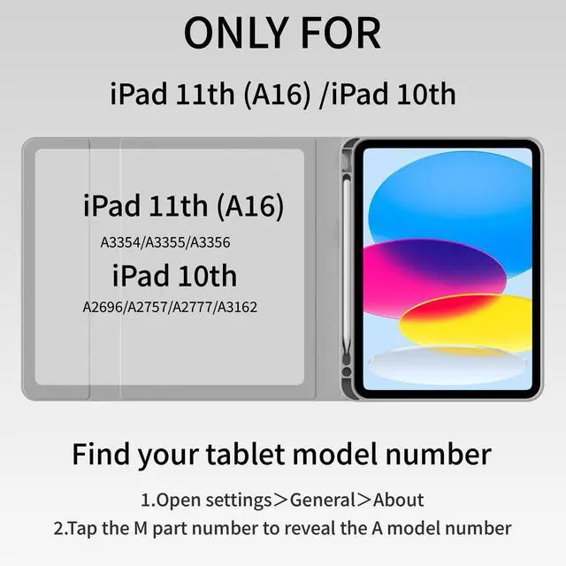 • Compatibility Model: This iPad case with keyboard is designed for iPad A16 2025 (A3354/A3355/A3356), iPad 10th Generation 2022 (A2696/A2757/A2777). NOT compatible with any other iPad models. Please check the back bottom of your iPad to find the model number before placing order