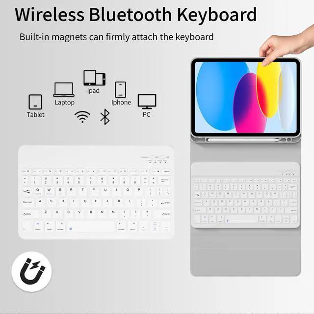 • Bluetooth Keyboard for Comfortable Typing: For iPad 10th generation keyboard case with lightweight design. The magnetic wireless keyboard is attached to this iPad cover with keyboard magnetically (supporting iPad/Android/Windows), let your iPad instantly become a portable laptop, perfect for working, typing, editing or watching videos, greatly improved your iPad productivity