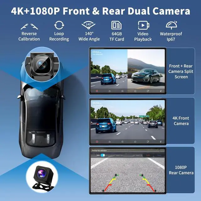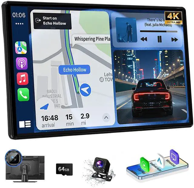 Wireless CarPlay & Android AutoWireless carplay screen for car support seamlessly connects with Android Auto and Carplay. Experience wireless connectivity between your phone and car's infotainment system with car play screen. You can access your phone's music, map navigation, messages, hands-free Phone Call etc. when carplay screen for car connects to your smartphone via Bluetooth&WiFi. Experience the convenience of wireless integration while driving safely. ^^ High Definition 4K+1080P Dual DashcamThis Wireless Portable Carplay Screen equipped with front 4K and rear 1080P waterproof cameras, it delivers detailed loop recording. No matter the day or night, car stereo with backup camera can accurately and clearly record your journey, providing a clear front view, can assist drivers in safe driving at night or in adverse weather conditions.