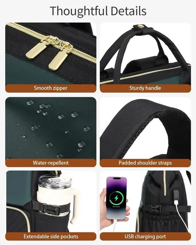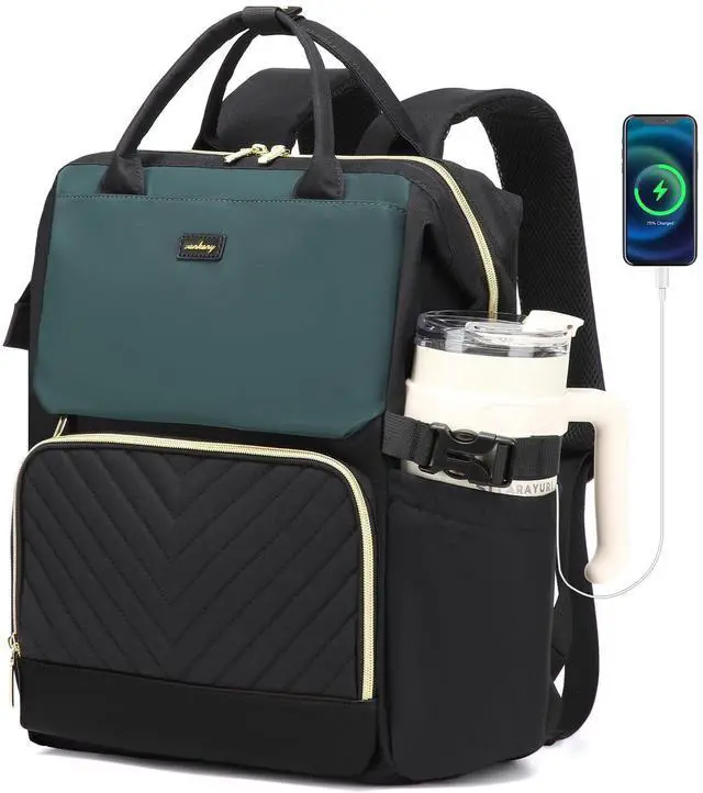 VANKANY Computer Backpack for Women, Work Bag Laptop Bookbag with Cup Holder & USB Charger for Teacher Nurse College Travel Back Pack, Gifts, Black DarkGreen