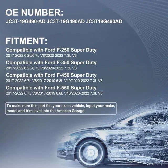 Fitment: Compatible with Ford F-250 Super Duty 2017-2022 6.2L V8 ^^ Compatible with Ford F-250 Super Duty 2017-2022 6.7L V8 ^^ Compatible with Ford F-250 Super Duty 2020-2022 7.3L V8 ^^ Compatible with Ford F-350 Super Duty 2017-2022 6.2L V8 ^^ Compatible with Ford F-350 Super Duty 2017-2022 6.7L V8 and more. To make sure this part fits your exact vehicle, input your make, model and trim level into the Garage.