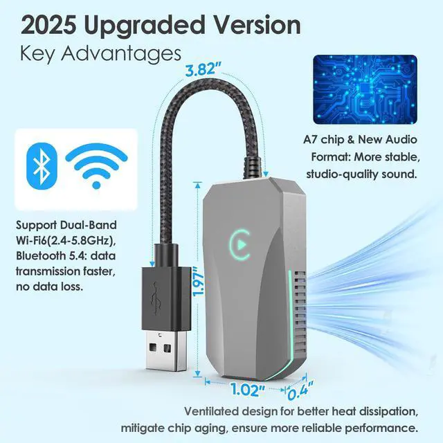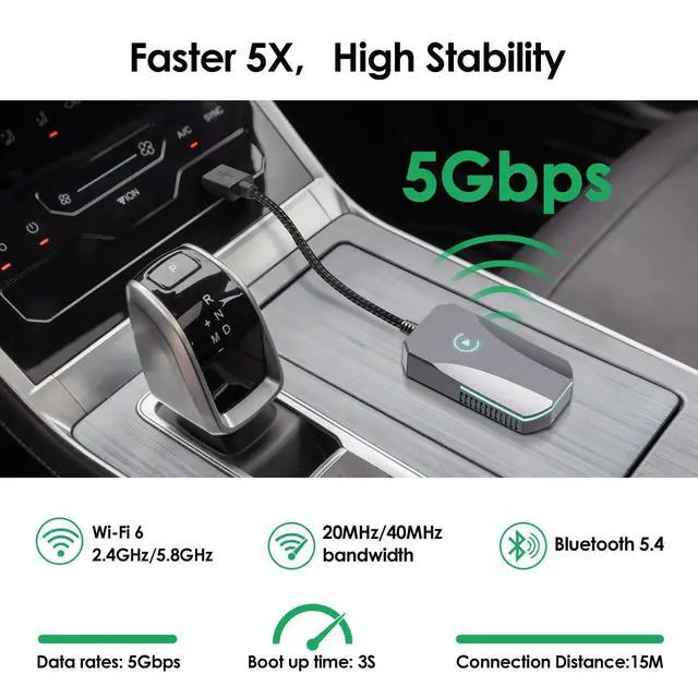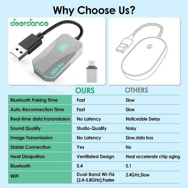 Covert Wired to WirelessDeerdance wireless CarPlay adapter is compatible ONLY with vehicles equipped with Wired CarPlay (NOT for any other System) and iPhone running iOS 10 or higher(iPhone 6+). Say goodbye to tangled cables, enjoy all the wired CarPlay features wirelessly, play music, navigate, make calls, handle messages through Siri, touchscreen, buttons or knobs, making driving safer and more fun. ^^ Easy to Setup & Faster & More StableSupport Bluetooth 5.4, Dual-Band Wi-Fi 6 ( 2.4 - 5.8GH z), deerdance CarPlay wireless adapter is easy to setup, no apps or software needed, simply enable Bluetooth&WiFi on iPhone, pair via Bluetooth to get it done.