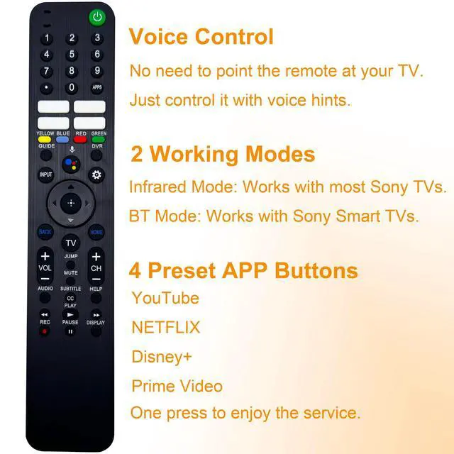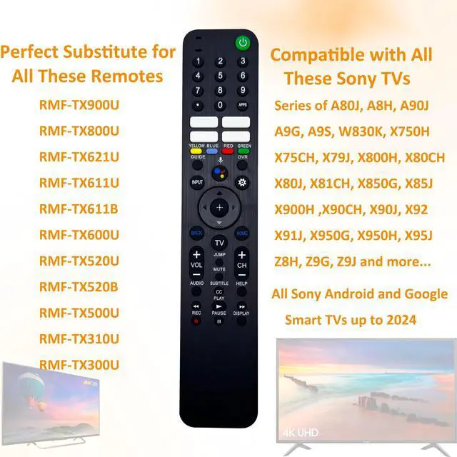 Voice command remote control replacement, supporting Google Assistant; press the Voice button and say "voice hints" for more operation tips. ^^ A perfect substitute of these remote controls: RMF-TX920U, RMF-TX910U, RMF-TX900U, RMF-TX820U, RMF-TX811U, RMF-TX810U, RMF-TX800U, RMF-TX621U, RMF-TX611B, RMF-TX611U, RMF-TX600U, RMF-TX520U, RMF-TX520B, RMF-TX500U, having 4 preset app buttons and voice search makes it easier for finding favorite shows. ^^ Works with Sony KD, XR, XBR smart Android and Google TV models released from 2018-2024 years, including HD, FHD, 4K, 8K LED and OLED TVS; Compatible with series of A75L, A80CK, A80K, A80CL, A80J, A80L, A8H, A90J, A90K, A95K, A95L, A9G, A9S, BRAVIA 3/ 7/ 8/ 9, W830K, X750H, X75CH, X75K, X77CL, X77L, X79J, X800H, X80CH, X80CK, X80J, X80K, X81CH, X850G, X85J, X85K, X900H, X90CH, X90CK, X90CL, X90J, X90K, X90L, X92, X91J, X93CL, X93L, X950G, X950H, X95J, X95K, X95L, Z8H, Z9G, Z9J, Z9K. ^^ Requires 2 AAA batteries (NOT Included); No need to set up, pair or program under IR (infrared) mode, saving time to replace an old or defective remote control smoothly; For more functionalities, pairing it to the television recommended.