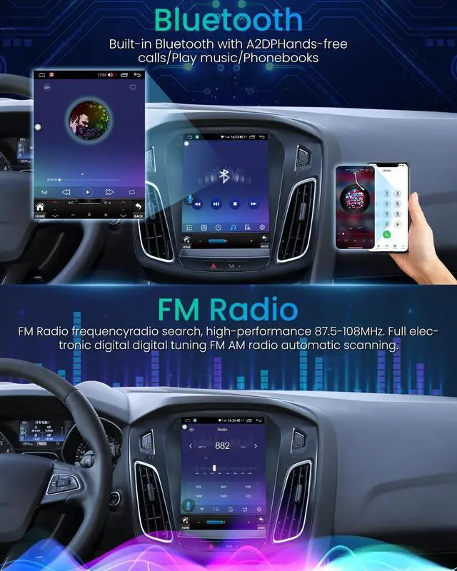 For Ford Focus Radio Upgrade - This Car Radio is tailor-made for your Ford Focus 2012 2013 2014 2015 2016 2017 2018. ^^ Android OS & HD Dispaly - The android12 Ford Focus stereo radio with a 4 cores processor, turning every tap and swipe into a silky-smooth experience. The star of the show is its exclusive upgrade 1024*768 resolution 10.4 -Inche IPS touchscreen, resulting in an explosion of vibrant, nuanced, and crystal-clear colors. ^^ Carplay & Android Auto - This Ford Focus Radio supports both CarPlay and Android Auto. Simply connect your phone to the car radio stereo via Bluetooth or USB cable, and indulge in mobile map navigation, music, and internet radio functions.