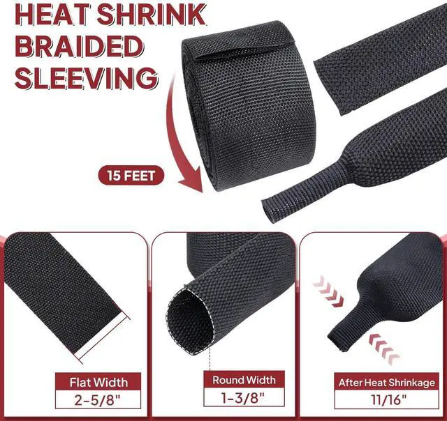 Wear Resistant Material: BuyUneed Heat Shrink Braided Sleeve made of polyester fiber and polyethylene, tightly woven structure sturdy and thick, Abrasion Resistance up to 150, 000 cycles. It stays stiff after shrinkage for durability and abrasion resistance ^^ 2:1