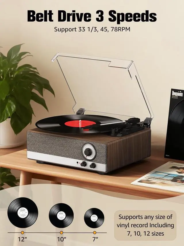 ^^ 3-Speed Belt-Drive Turntable: Precisely play 7", 10", and 12" vinyl records with adjustable 33 1/3, 45, 78 RPM speeds. Comes with a 45 RPM adapter.