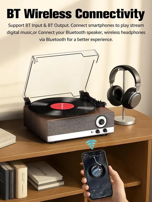 Bluetooth Record Player: Support BT Input & BT Output. Connect smartphones to play stream digital music, or Connect your Bluetooth speaker, wireless headphones via Bluetooth for a better experience. Perfect for modern vinyl record lovers seeking wireless convenience.
