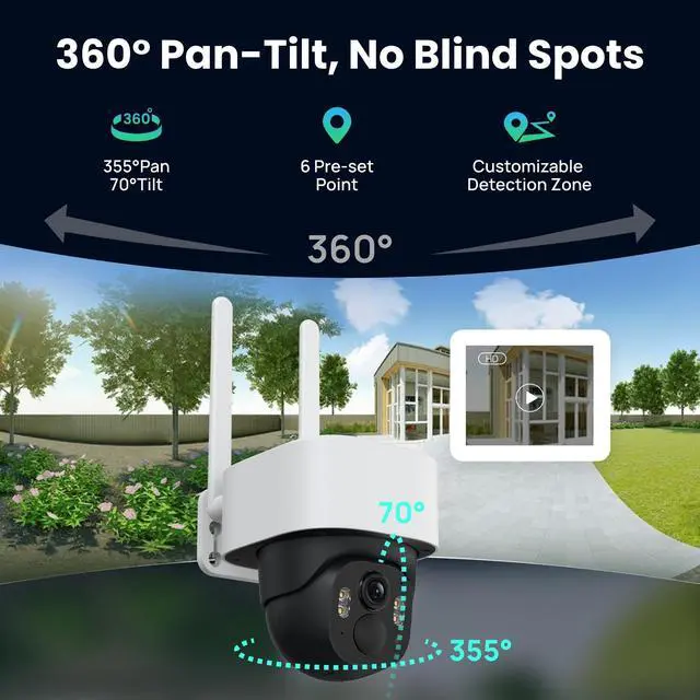 Smart Auto-Tracking: Enjoy full-area protection with 355 horizontal and 70 vertical rotation. Smart auto-tracking automatically follows people, vehicles, or animals, keeping them in frame. Set up to 6 preset monitoring points to instantly focus on critical areas like gates, driveways, or entrances. ^^ 4MP HD Video, Smart Detection & Flexible Local Storage: Capture sharp 4MP HD video with 6 digital zoom and color night vision. Intelligent human and vehicle detection reduces false alerts, while the built-in spotlight and siren help deter intruders. Supports Micro SD cards up to 256GB (not included) for secure local storage no cloud subscription required.