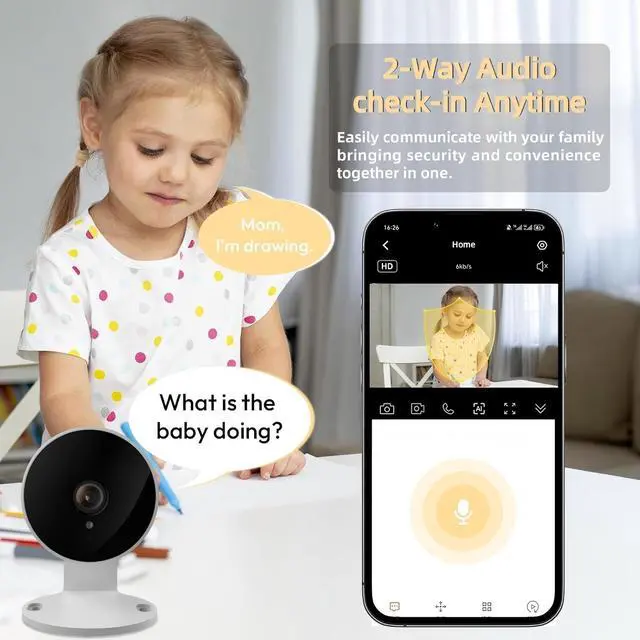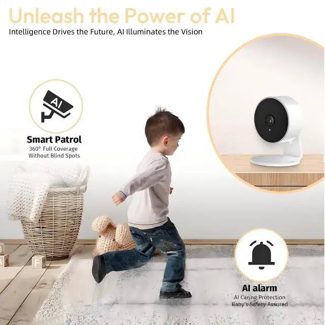 Compact size, Wi-Fi connectivityThis compact camera can be deployed in any corner of your home. The wired security camera supports 2.4GH z Wi-Fi for seamless connectivity and is compatible with the latest smartphones. ^^ AI Voice Change for 2-Way TalkBuilt-in two-way microphone and speaker allow you to make smooth and clear two-way calls to visitors at your door, and you can use the AI function to change your voice to protect your privacy, or send alarm warnings or have a conversation. ^^ 3MP High-Definition ResolutionThe indoor camera features 3MP high-definition resolution, enabling you to capture details of interest with clarity.