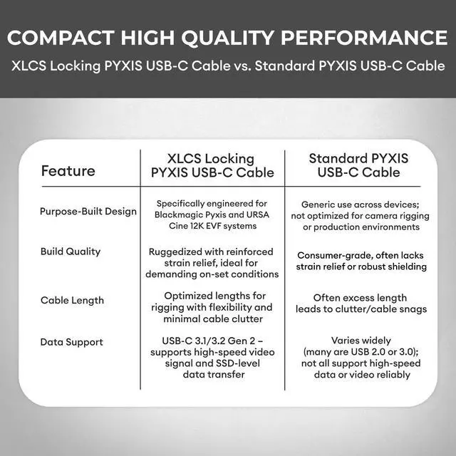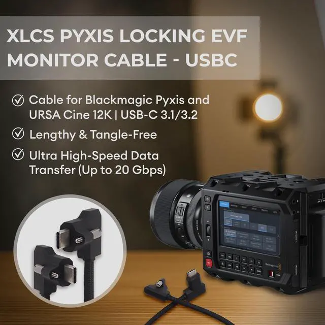 Secure Locking Design Designed for Blackmagic Pyxis & URSA Cine 12K, the cable is locked to the camera body to avoid accidental disconnection and to shield ports from damage while shooting ^^ Ultra-Flexible Build Engineered for effortless integration, the extremely flexible cable glides easily around camera accessories without compromising on secure connectivity ^^ Blazing Fast Speeds With USB-C 3.2 technology, this cable provides blazing fast data transfer speeds of up to 20Gbps, providing smooth and efficient performance for high- resolution video workflows ^^ Versatile Size & Color Options Comes in 30cm, 50cm, 80cm, and 350cm lengths, with Red or Black color options.
