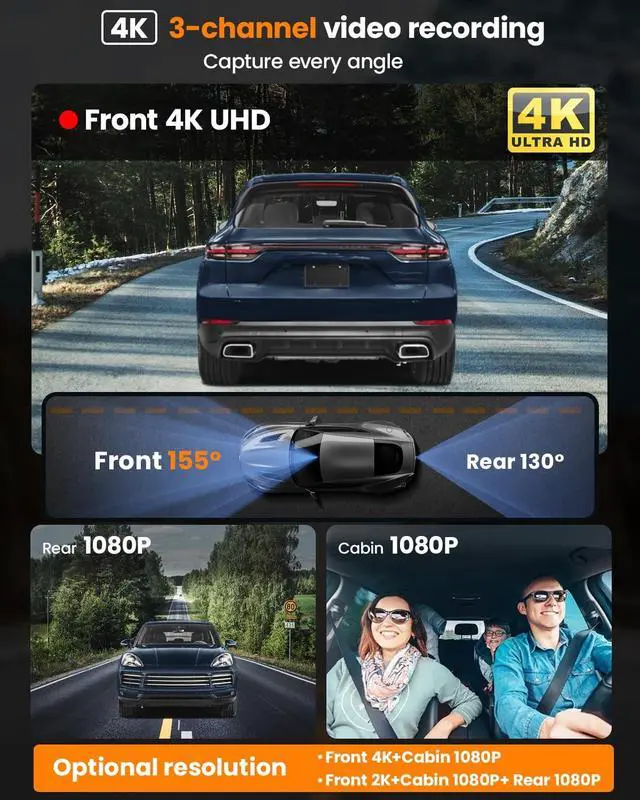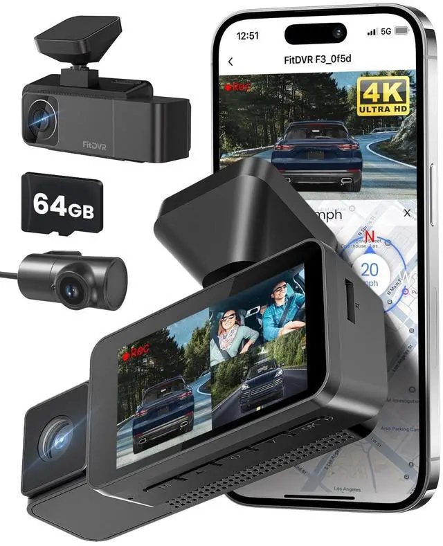Unmatched Coverage & Clarity3 channel dash cam features three high-resolution lenses that capture the front, rear, and interior of your vehicle simultaneously. Whether on the road or inside the car, never miss a detail. FitDVR F3 dash cam front and rear camera offer 2 recording options: when using two cameras, the resolution is 4K (front) + 1080P (interior); when using three cameras, the resolution is 2K (front) + 1080P (interior) + 1080P (rear). ^^ Advanced 4K UHD TechnologyEquipped with cutting-edge 4K Ultra High Definition (UHD) technology, this dash camera for cars delivers exceptional image clarity and detail. HDR (High Dynamic Range) support enhances visibility in low-light and challenging lighting conditions. Powered by Sony Starvis technology for superior image quality even in low-light environments. ^^ Infrared Night Vision for InteriorThe cabin camera comes with infrared night vision capabilities, ensuring clear video recording even in very dim light. Additionally, 4 built-in supplementary lights provide extra illumination for low-light situations. ^^ Built-in GPS for Real-Time DataTrack your driving data with the integrated GPS module. This security camera for car records speed, acceleration, altitude, and driving routes, all synchronized with your video footage for added context and security. ^^ Wi-Fi Connectivity & Mobile AppThis dashcam for cars includes built-in Wi-Fi, allowing you to connect to your phone via the app. Easily download and share videos to social media platforms.