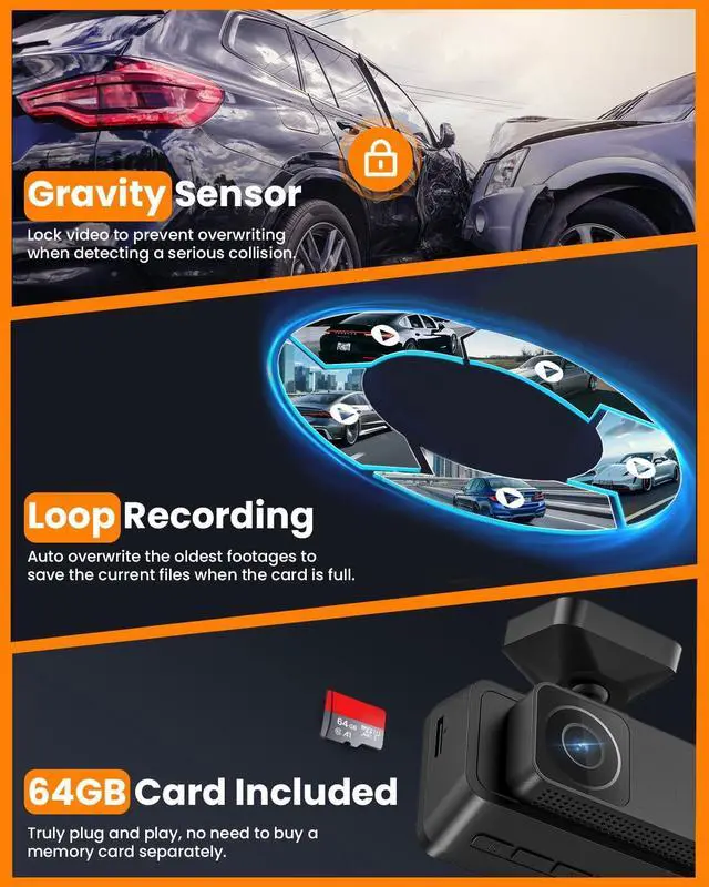 The app also includes a simple video editing feature for personalizing your footage. ^^ Easy Installation with Car ChargerPowered through your cars cigarette lighter, installation is quick and hassle-free. For a plug-and-play experience, you can also purchase the optional FitDVR Y-cable separately to simplify setup. ^^ Adjustable & Detachable for Easy PortabilityFitDVR 3 channel dash cam features a convenient 3M adhesive mount that securely attaches to your windshield. With a flexible, adjustable design, you can easily adjust the angle for the best view. The detachable base allows you to quickly remove the dashcam when you leave your car, keeping it safe and portable.