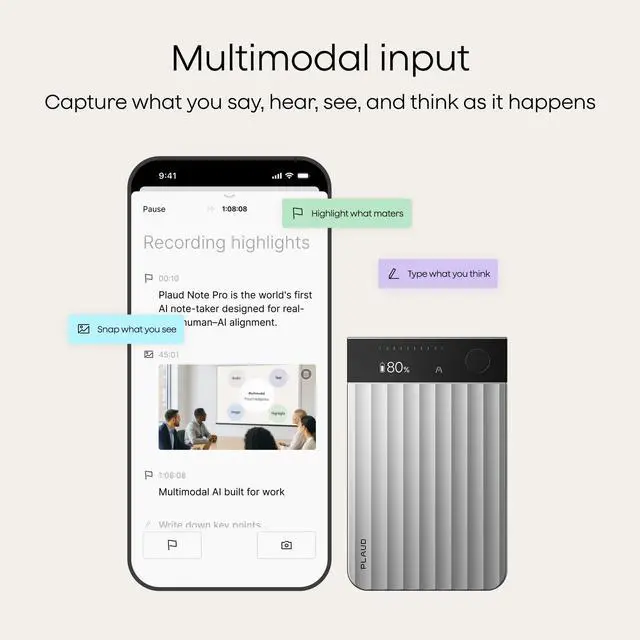 Plaud": Unlock deeper insights with this interactive AI. Ask questions, extract key points, draft emails, and get next-step suggestionsall grounded in your original audio for reliable, ready-to-use answers ^^ INTELLIGENT RECORDING WITH AI DIRECTIONAL AUDIO: Enjoy seamless, intelligent recording with Plaud Note Pro. Its AI automatically switches between call and meeting modes while recording, while directional audio and real-time spatial awareness minimize noise to capture voices with crystal clarity ^^