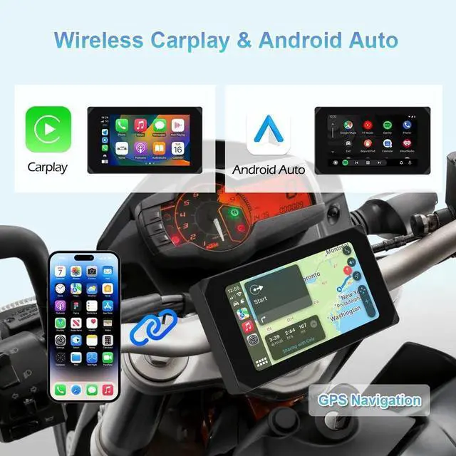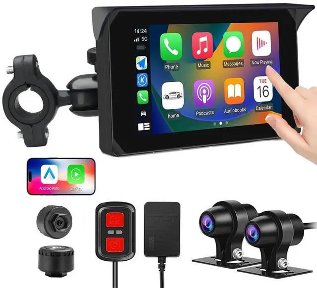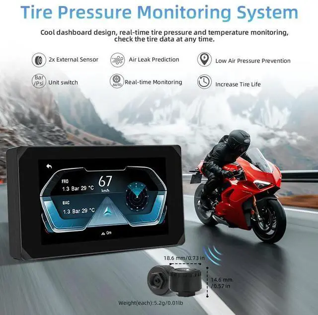 Android Auto: The motorcycle dash camera supports wireless Car play & Android Auto. You can connect the phone to the display via Bluetooth or WiFi, and then use the projection function to synchronously display the phone's maps, music, calls, messages and other app. You can also use the mobile app "Viidure" to connect to the WiFi module of the recorder and view recorded videos in real-time ^^ 5 Inch HD Touchscreen and HD 1080P Cameras5 Inch high-definition IPS touch screen, making the visual effect more intuitive and the touch responsive. The display brightness can be adjusted as required. 140 wide angle lens, front and rear both 1080P resolution. The motorcycle cameras system can help you get clear video and ensure your driving safety ^^ Tire Pressure Monitoring System and GPSThe rider can know the driving speed, atitude, longitude and latitude of the recorded video through GPS. You can view motorcycle tire pressure and temperature in real time from the screen, effectively avoiding accidents. The installation is simple, just need to install the tire pressure monitoring sensor on the tire ^^