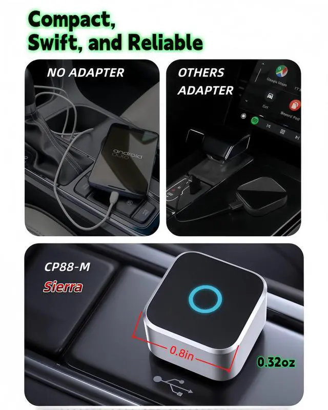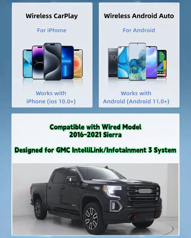 This wireless adapter is specifically engineered for the Sierra models launched between 2016-2021 the ones equipped with wired CarPlay and wired Android Auto. Specifically designed Display Audio with GMC IntelliLink/GMC Infotainment 3 Infotainment System, it delivers a far more seamless connection and faster response speeds. ^^ Ultra-Compact Design ( 0.8 in ^^ 0.32 oz)Meet the Lugzix Mini Cube Adapter (2026 Model) thumb-sized, 50% smaller than its predecessor. Sleek grooved texture delivers a premium touch and extra grip for easy plug-and-pull. Small body, big performance. ^^ Vehicle-specific adapter with 5GHz WiFi 6 &