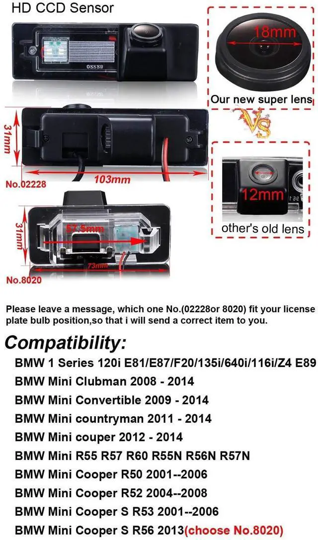 Waterproof and Dustproof Design: The reversing camera is designed to be waterproof and dustproof, enabling it to perform reliably in various adverse weather and road conditions, ensuring high-quality rearward vision in any situation. ^^ This camera is your best helper for safe driving, providing comprehensive observation and monitoring, allowing you to back up with more ease. By purchasing this product, you will enjoy high-quality reversing experience! ^^ Compatible with B M W 1Series 120i E81/E87/F20/135i/640i/116i/Z4 E89; Compatible with BMW Mini Clubman 2008-2014; Compatible with BMW Mini Convertible 2009-2014; Compatible with BMW Mini countryman 2011-2014/ couper 2012- 2014; Compatible with BMW Mini R55 R57 R60 R55N R56N R57N; Compatible with BMW Mini Cooper R50 2001-2006/ R52 2004-2008; Compatible with BMW Mini Cooper S R53 2001-2006; Compatible with BMW Mini Cooper S R56 2013(choose No. 8020);