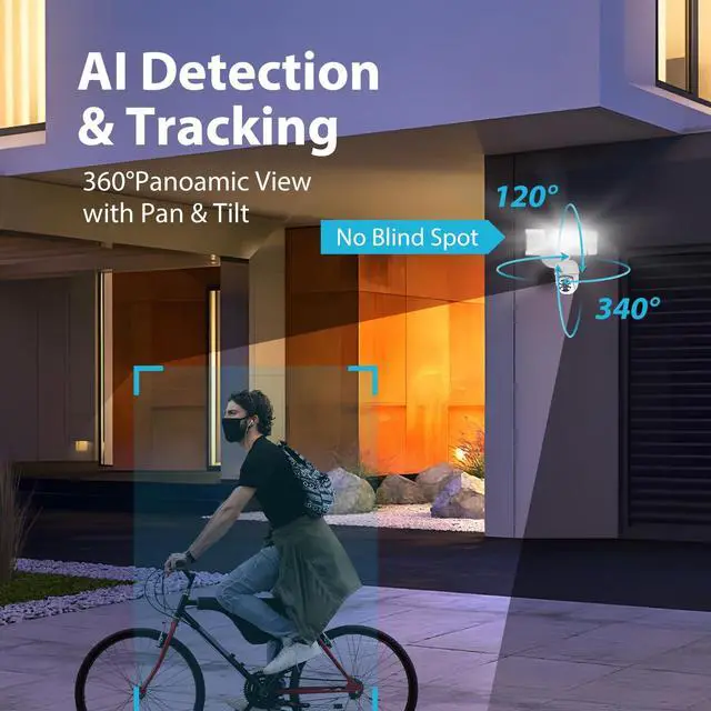 View & Smart Auto-Tracking: Never miss a thing with our 360panoramic view. This floodlight security camera boasts a 340horizontal and 120vertical rotation range with intelligent auto-tracking, ensuring complete coverage and keeping moving subjects in focus. Capture every angle with this versatile outdoor security camera. ^^ Advanced Motion Detection with