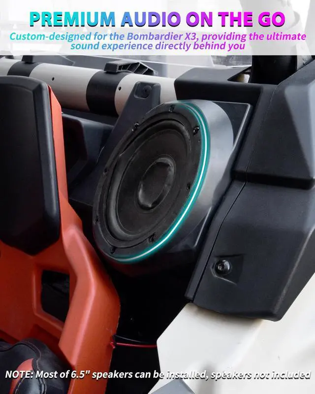 Precision Fit & Wide Compatibility: Designed specifically for Can-Am Maverick X3/X3 MAX/XDS/XRS/Turbo RR (2017-2026), these speaker pods seamlessly integrate with the rear seat space, ensuring a snug and secure installation. Compatible with most 6.5" speakers (max width: 3.77" / 95.8 mm; height: 2.6" /66mm)spacers may be needed for certain models ^^