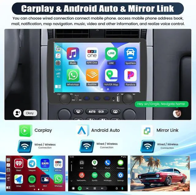 Power output: 4*45W ^^ Built-in Carplay System & Android AutoUse Bluetooth/USB data cable to connect. Connect with mobile phone to access mobile phone contacts, notification, map navigation, music, video and other information, and also implement voice control. Android mobile phone can download Android Auto, use USB data cable to connect.