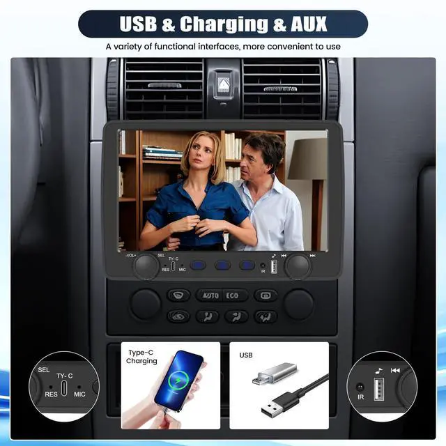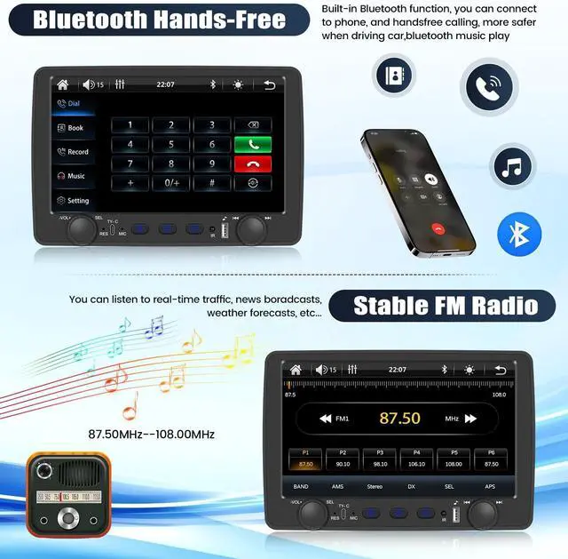 Upgraded Dual system mirror link: IOS/Android mirror link(IOS/one-way, Android) ^^ FM Radio & EQFM 87.5 -108, with 18 preset stations, select your favorite stations and save it. You could know daily news anywhere anytime. Equipped with EQ equalizer, excellent noise reduction, bass enhanced amplification, creating an immersive music feast ^^ Bluetooth & USB/Type-C Color ButtonConnect to your phone with bluetooth, you could achieve hand-free, listen to your phone's music and audiobooks. Support U disk and USB charging, you could download the favorite movie in U disk, then play in the stereo, provide you a safer and interesting driving trip ^^ Rear View Camera Input & SWCWith a backup camera, when reverse gear pull, the stereo screen will automatically shows the image. With Steering wheel control function, Needn't to get up to press the function button, only need steer wheel control learning, and then you can control your needs on the steering wheel
