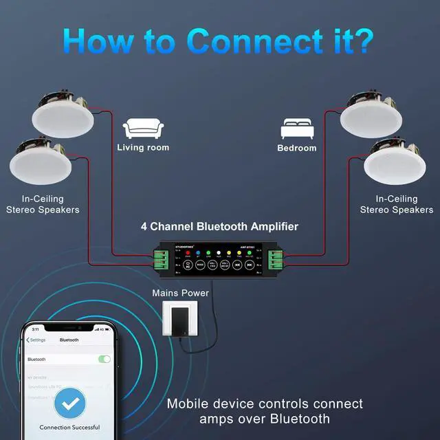 High-Performance Bluetooth 4-Channel Amplifier(MIC/AUX/USB/BT Functions) Upgrade your audio setup with STUDIOFINIX amplifier. Its Bluetooth 5.0 offers fast, high-quality transmission over a long range, Connect four speakers at once for full-room sound. ^^ Crystal Clear SoundWith the in ceiling 6.5 -inch woofer and 1-inch tweeter, you will be able to enjoy crystal clear sound and comfortable listening from anywhere in the room. Also, you can place the speakers in any room of your home, so that you do not have to use any floor or shelf space, for a unique sound experience.