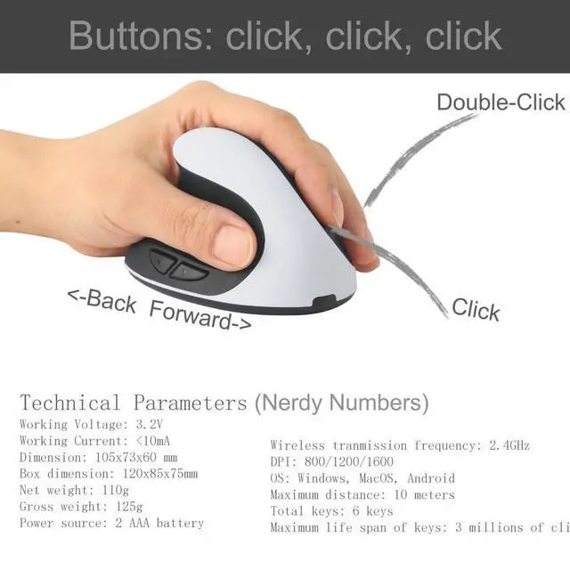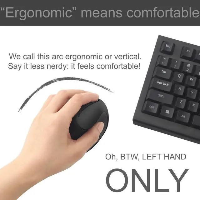 wireless setup: plug-N-play. ^^ Our left handed vertical mouse is compact ( 4.1 in) and fits small and medium hands (Left hand ONLY). ^^ Similar function as Anker left handed mouse, affordable alternative to costly brand left handed mouse ^^ Our left handed mouse has a glossy-n-matte color pattern. vs. male dominated black/neon color style. ^^ Fixed known issues; Type C converter included; Upgraded packing; USA based customer service