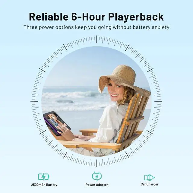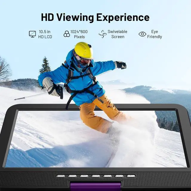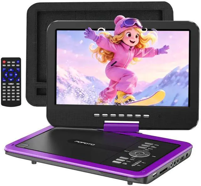 10.5" HD Flexible Screen -- POFOTO's portable DVD player features a vibrant 1024600 resolution display (60% sharper than standard 800480 screens). With 270 rotation and 180 flip capability, it delivers perfect viewing angles from any position. Enjoy brilliantly clear visuals that move with you ^^ Unique Button Design -- This DVD player portable has two sets of operating systems, one for daily viewing and another for on-board viewing. Intuitive buttons under the screen make play/pause/volume control a breeze, even mounted on a car headrest. Keep little travelers laughing and engaged for miles ^^ 6-Hour Playtime -- POFOTO portable DVD player for kids features a robust 2500 mAh battery, providing up to 6 hours of continuous play.