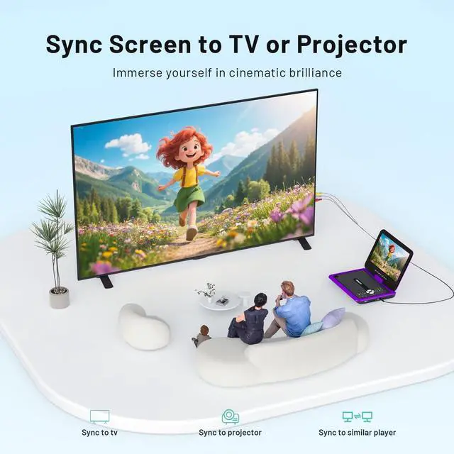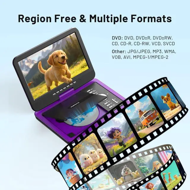 With a complete charging kit, including a 70-inch AC adapter and car charger, you'll never have to worry about running out of power during your adventures ^^ Region-Free & Multiple Formats -- The portable DVD player for car allows direct playback of DVD, DVDR, DVDRW, CD, CD-R, CD-RW, VCD and SVCD (Blu-ray and pirated discs not supported). It also supports multimedia files via USB and SD card (up to 32GB), including VOB, AVI, MP3, WMA, JPG, JPEG, MPG1/ MPG2 (resolution 720*756). The region-free design ensures seamless playback from any region ^^ Seamless Big-Screen Sync -- This portable DVD player with screen easily transforms your TV into a cinema.