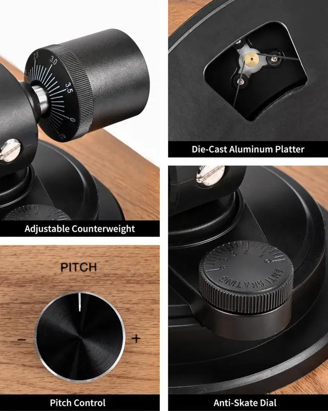 ^^ Easy Set-Up: All you have to do is attach the turntable belt, then set the platter in place. Factory pre-installed counterweight and advanced anti-skate control ensure that the needle stays balanced, producing detailed sound. The variable pitch control lets you adjust the speed slightly for different playback effects. ^^ Support 33 1/3&45