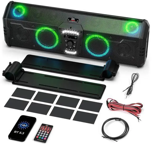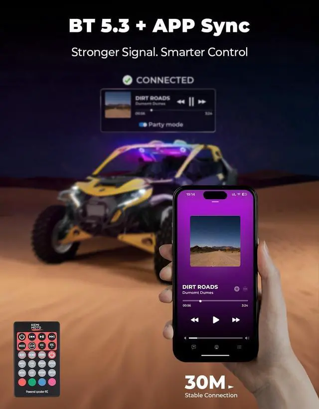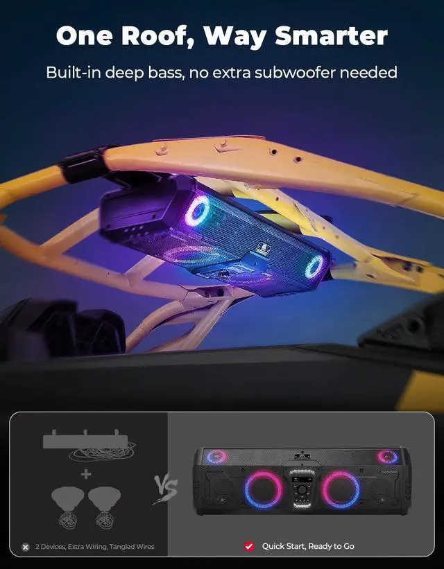 For Most UTVs: Fits 1.45 ''-2'' roll cage and make sure the distance between two parallel roll cages is 930-1500mm (36-59in). This SXS sound bar fits on most popular UTVs, Compatible with Can-Am Maverick X3 & X3 Max, and Compatible with Can-Am Maverick R/ Polaris RZR XP/ YXZ1000R / Teryx4 / Talon 1000R / Talon 1000X / Pioneer 1000 / Arctic Cat Wildcat/ ZFORCE. Not Compatible with Defender, Ranger, Golf, 25 rzr pro xp, 2025 RZR Pro XP 4, 23 rzr xp1000, 2023 RZR XP 4 1000, Commander Trail. It can be installed with or without a roof, and the very thin Throat Clamp means that it will not interfere with the use of the roof or windshield ^^ 3 Ways to Connect and ControlEnjoy Bluetooth 5.3 for stable wireless streaming from over 30M away. Use the USB port or the 3.5 mm AUX input. Control your music effortlessly via the included remote, the intuitive front panel, or the dedicated smartphone app. The power of choice is in your hands ^^ Built for