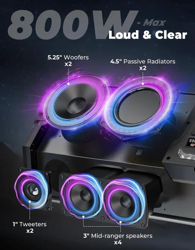 All-in-One Sound System: The KEMIMOTO Midnight 90 is a complete all-in-one roof audio system, integrating 25.25" woofers, 24.5" passive radiators, 4 mid-range drivers, and 2 tweeters inside a precision-tuned chamber. It delivers full-spectrum sound with deep, chest-pounding bass. An integrated FM radio adds extra listening options without requiring any separate equipment, giving you a powerful and immersive overhead sound system ^^ 800W