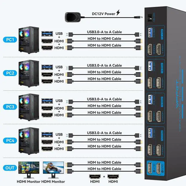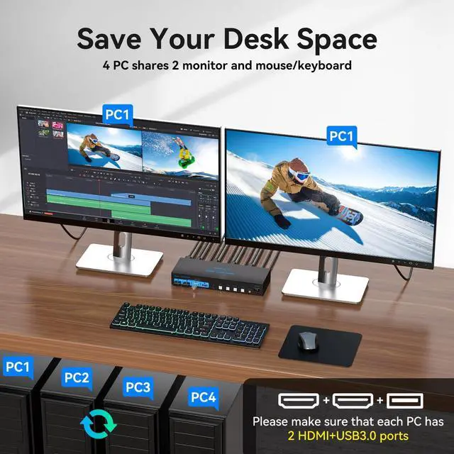 HDMI KVM Switch 4 PortsThis 4 in 2 out HDMI dual monitor to switch between 4 computers and connect 4 computers sharing 1 keyboard and mouse set and 2 monitors. Keyboard and mouse and 2 monitors (Note: the computer's host graphics card must have 2 HDMI outputs, the device requires your computer to support dual-screen display or multi-screen display)