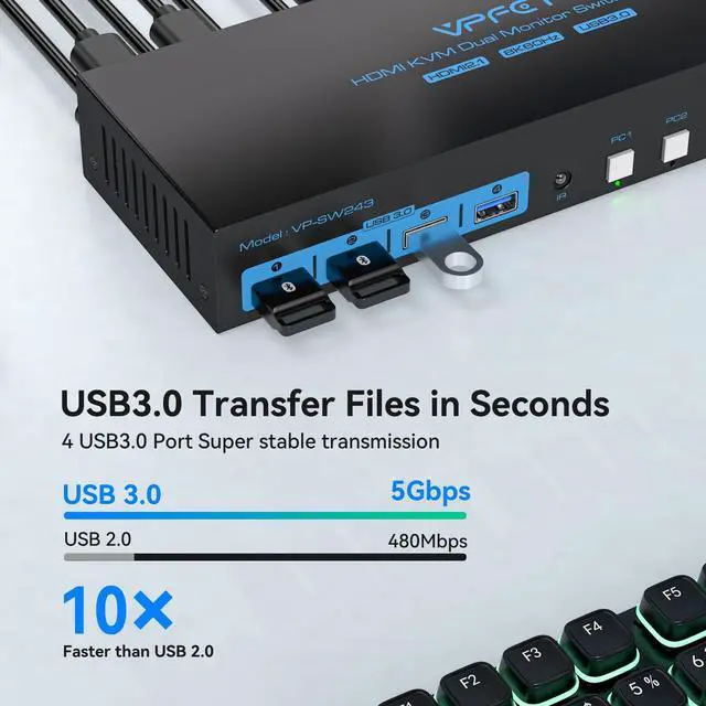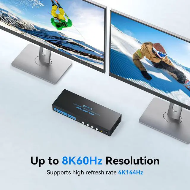HDMI 2.1 KVM Switch This KVM dual monitor switch supports resolutions up to 8K60Hz,4K144Hz and below and is backward compatible with lower resolutions (e.g.4K120Hz,4K60Hz, 1080p etc.) DP 1.4 compliant HDMI 2.1 compliant (Tip: For 8K output, both the computer and the monitor must be 8K compliant and use 8K compliant HDMI 2.1 cables).