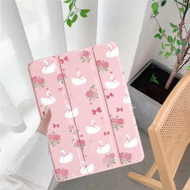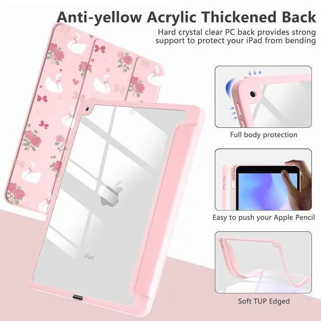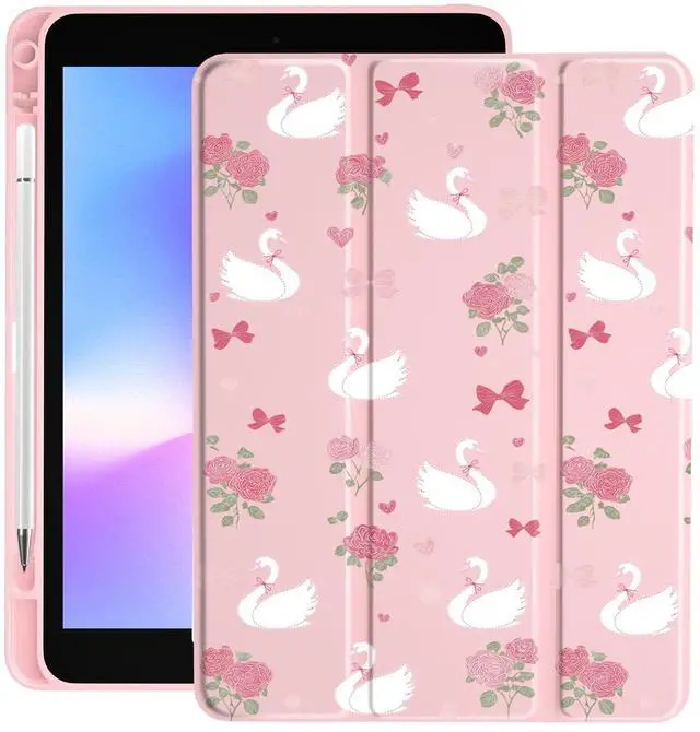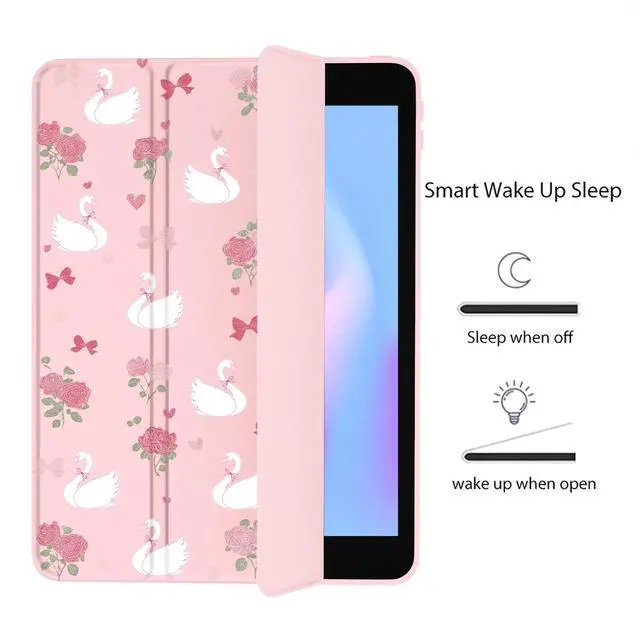 LuGeKe Swan Flowers Case for iPad 5th/6th Generation Unique Case,Pencil Holder & Clear Acrylic Back & Trifold Stand Cover for Women