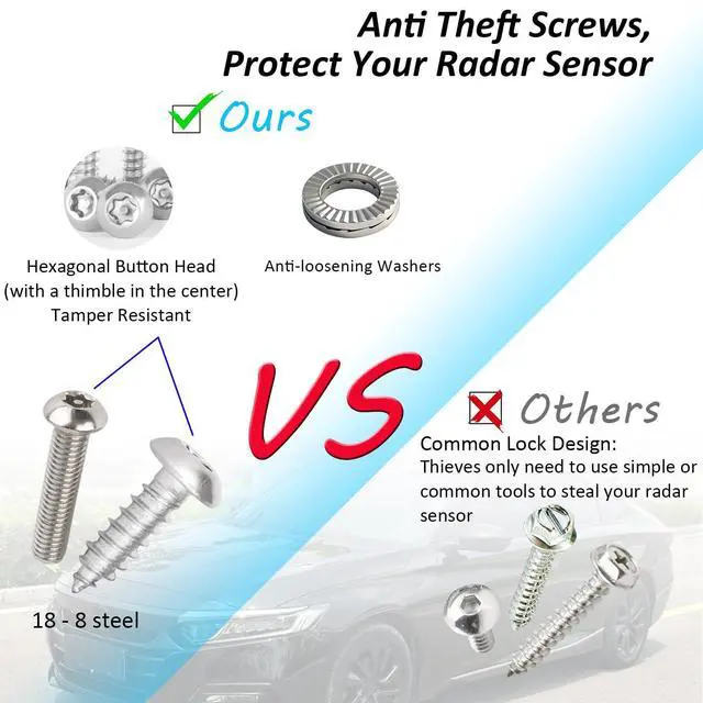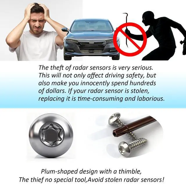 Prevent Your Radar Sensor from Being StolenThe front radar sensor is a critical and expensive component of your CR-V's safety system. Our protector shield is equipped with pry-proof, tamper-resistant Torx screws. It is specially designed to prevent theft of your radar sensor while ensuring its safe and proper functioning. The unique screw design requires a special key tool (included) for installation and removal. This makes it extremely difficult for thieves to steal the sensor, saving you from costly replacements and hassle. ^^ Complete DIY Installation Kit IncludedWe include 2 complete sets of specialized anti-theft screws to ensure a perfect and secure fit for your vehicle.
