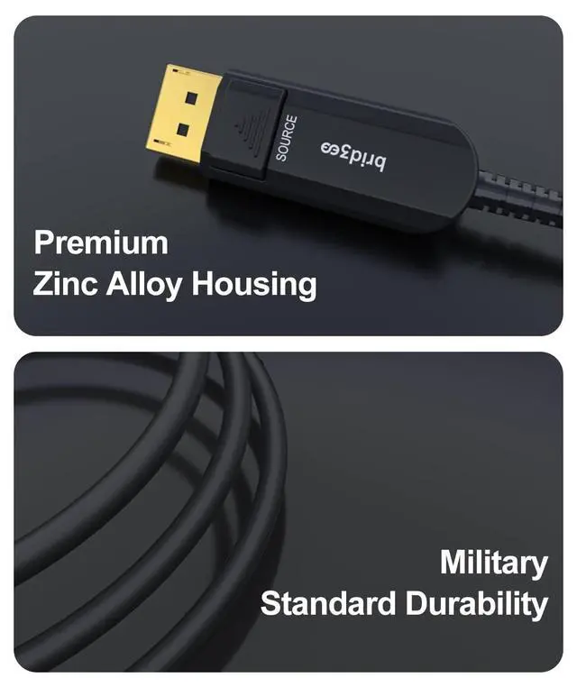 1 Durable & Sleek BuildCrafted for longevity, this fiber optic DisplayPort 2.0 cable features a solid yet flexible design, with a premium zinc alloy connector for superior durability, corrosion resistance, and a sleek, modern finish. Built to withstand frequent use while maintaining top-tier performance. ^^ 2 8K UHD & High-Speed PerformanceUnlock stunning 8K@60Hz and 4K@120Hz resolutions with ultra-smooth motion and vibrant colors. Supporting 32Gbps bandwidth, eARC, Dolby Vision, HDR10+, 3D, DSC, VRR, and more, this cable delivers an immersive gaming and cinematic experience.