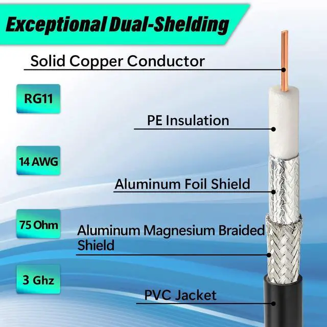 ^^ Signal Low Loss -- RG11 is bigger in cross section and attenuates the signal less than rg6 cable. It could support better signal transfer with minimum signal loss over large distances and higher frequency use. It helped keep the long run from being a problem. You get what you pay for here. ^^ Great Picture Quality -- This rg11 coaxial cable use a 14 AWG center conductor, with exceptional dual-shielding - using 60% braid and 100% foil for maximum signal performance. It is great for long runs and can deliver a clear TV signal.