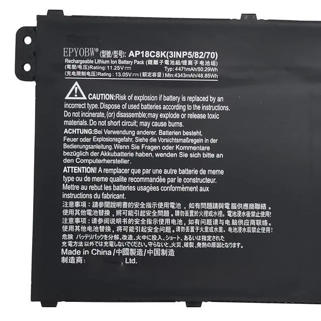 Condition: Brand New. ^^ Replace Part NumberAP18C8K 3INP5/82/70 ^^ Compatible with Laptop Models for Acer Swift 3 SF314-42 SF314-57 SF314-57G SF314-58 SF314-58G SF314-59 Series; for Acer Aspire 7 A715-42g Series; for Acer Aspire 5 A514-54 A514-54G A515-56G A515-57 Series; for Acer TravelMate P2 TMP215-52 TMP215-52G TMP215-53 TPM215-53G Series; for Acer Chromebook 15 CB315-3H CB315-3HT Series; for Acer Chromebook 314 C933 Series; for Acer Chromebook 314 C933 Series; for Acer Aspire 5 A514-52 A514-52-58U3 Series ^^ Purchase SkillsPlease open the back cover of the laptop before ordering and make sure that the original battery model is consistent with the listing. After getting the battery, please install the battery correctly, make sure that the battery connector is firmly connected to the laptop motherboard, and use the original charger to charge the laptop. Discharge the new battery to 5% (not 0%), then charge and cycle 3-4 times to wake up the new battery. ^^ EPYOBW PromiseAll EPYOBW's batteries are certificated by UL/CE/FCC/RoHS. Our batteries are tested by strict quality control standards to ensure that the capacity is true, stable current, low self-discharge. And we also have short circuit, overheat, and overload protections.